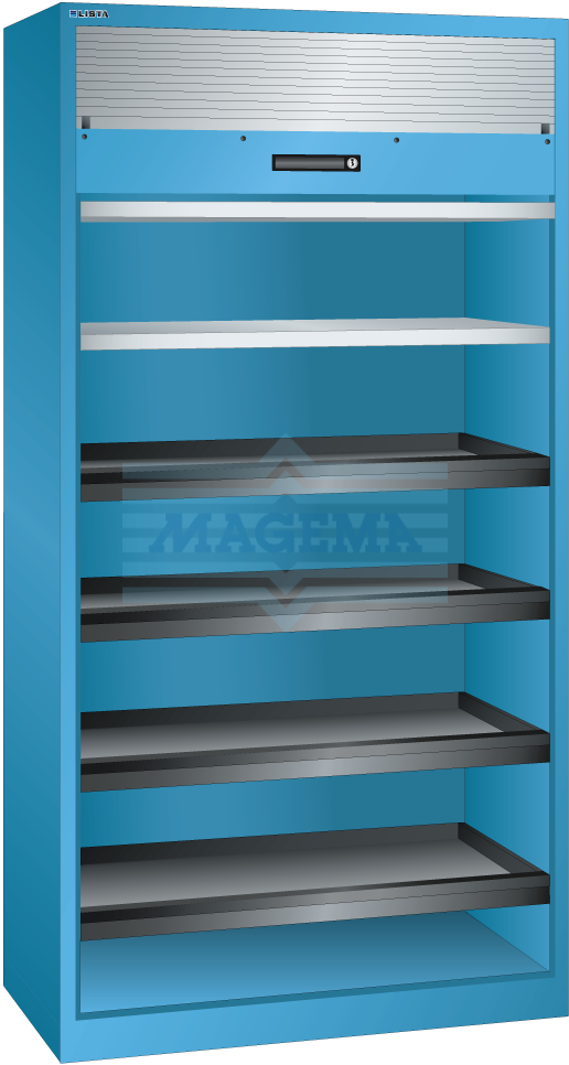 Rolluikkasten van Lista geven u toegang tot de opgeslagen items zonder dat er deuren uitsteken, een ideale oplossing voor kleine, smalle ruimten. Het soepel lopende rolluik van PVC is met één hand te bedienen en fixeert op elke hoogte. (bij vertikale rolluiken). De kasten met een horizontaal rolluik zijn door de maximale legbordbelasting van 32 of 47 kg meer geschikt voor documentenopslag of kantooromgeving.