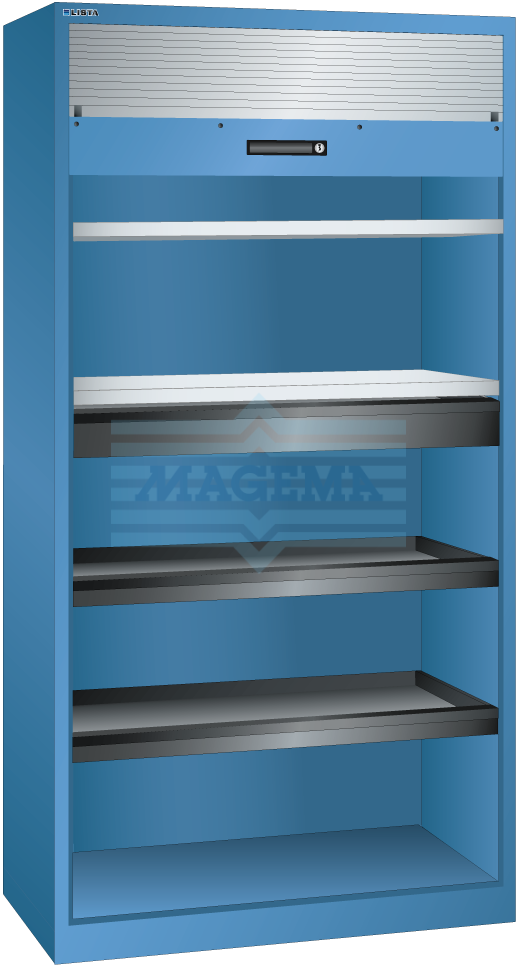 Rolluikkasten van Lista geven u toegang tot de opgeslagen items zonder dat er deuren uitsteken, een ideale oplossing voor kleine, smalle ruimten. Het soepel lopende rolluik van PVC is met één hand te bedienen en fixeert op elke hoogte. (bij vertikale rolluiken). De kasten met een horizontaal rolluik zijn door de maximale legbordbelasting van 32 of 47 kg meer geschikt voor documentenopslag of kantooromgeving.