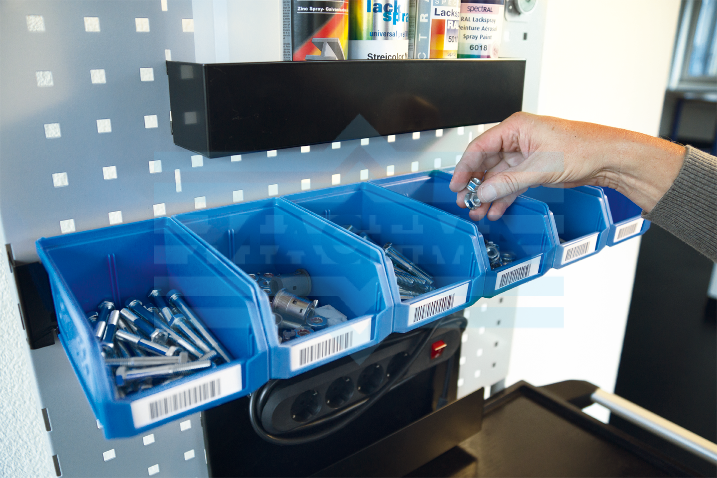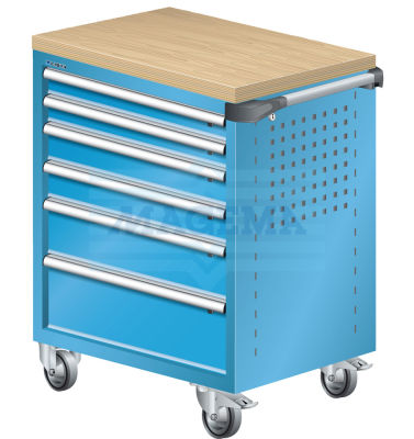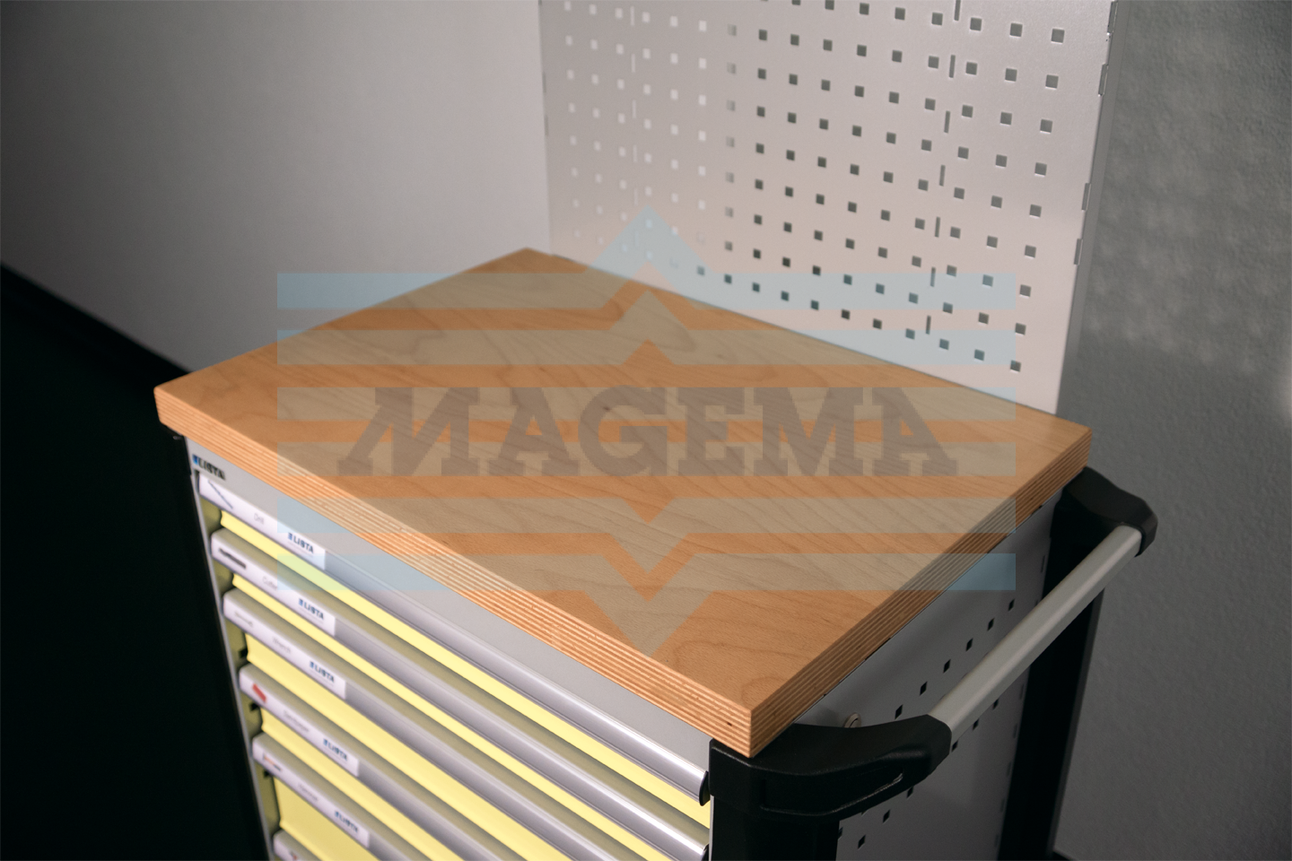 Deze Lista gereedschapswagens zijn uitgevoerd met een multiplex werkblad van 40 mm dik. Hierop kan bijvoorbeeld een kleine bankschroef gemonteerd worden, zodat u niet alleen al uw gereedschap bij de hand heeft, maar ook de beschikking heeft over een werkbank. Bijzonder handig als er op lokatie aan losse delen gewerkt moet worden. Aan de rechterzijde van de schuiflade is een indivuduele vergrendeling gemonteerd, welke naar links geschoven moet worden om de desbetreffende schuiflade te kunnen openen. Met de beschikbare accessoires kunt u de gereedschapswagen volledig naar uw wens uitvoeren. En het standaard Lista indelingsmateriaal stelt u in staat de individuele laden zo efficient mogelijk in te richten. Vraag een van onze specialisten naar de mogelijkheden.